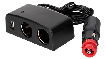 Triple socket (2x power, 1x USB) with universal plug | Cable length 1,5 mtrs Inner Ø 12 mm 12V -> 5V |